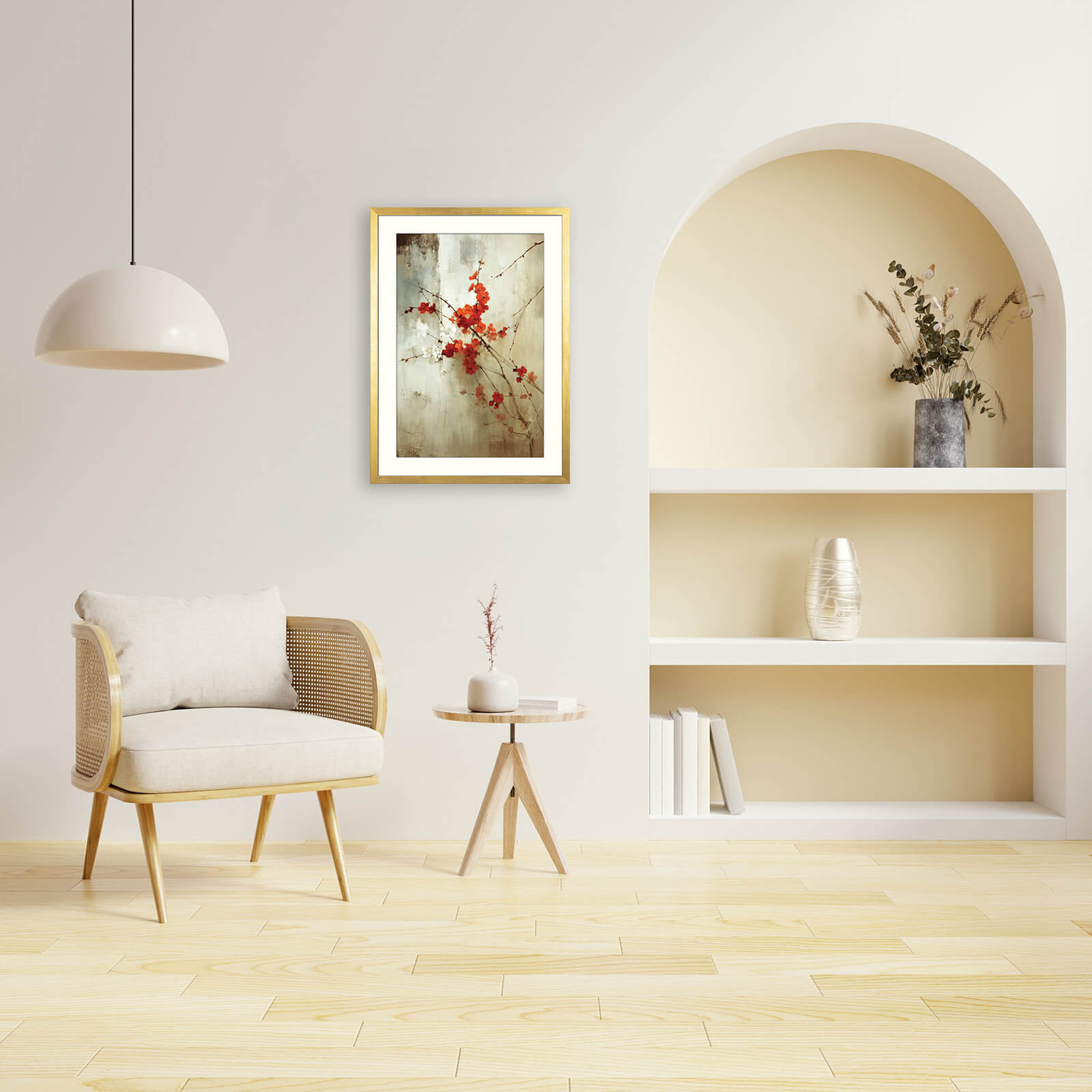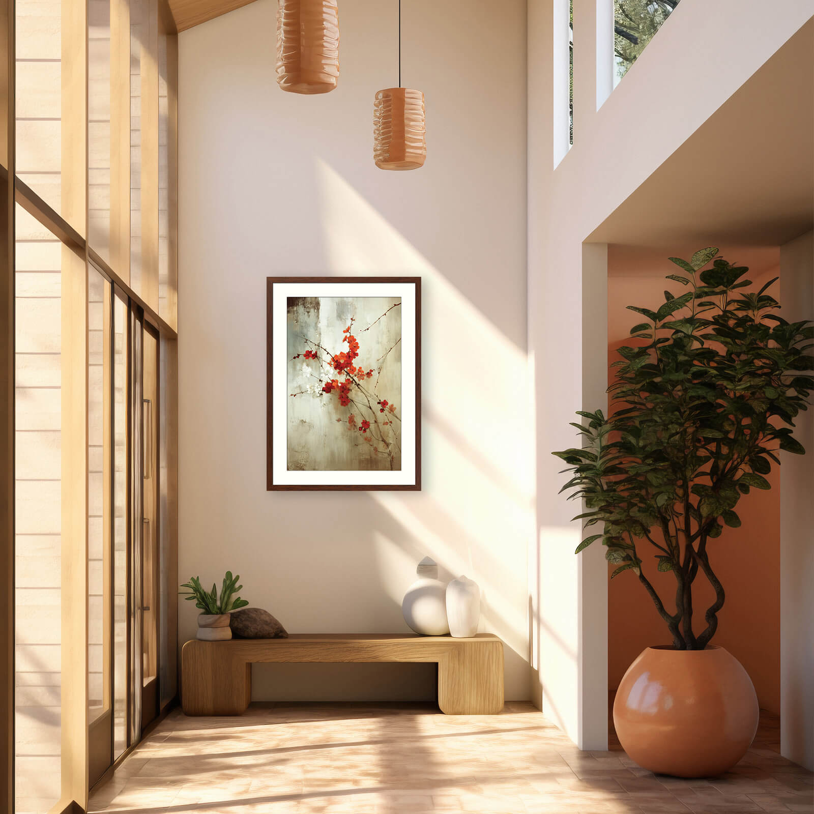 This Japanese inspired wall art print features elegant red and white plum blossoms painted against a softly textured, neutral background. The delicate branches and blossoms appear to float in a space between realism and abstraction, evoking a quiet sense of renewal and impermanence. Reflecting the aesthetics of Sumi-e (Ink Wash) and Wabi Sabi, this piece brings natural grace and understated beauty to your walls—perfect for tranquil, minimalist, or Japandi-styled interiors.